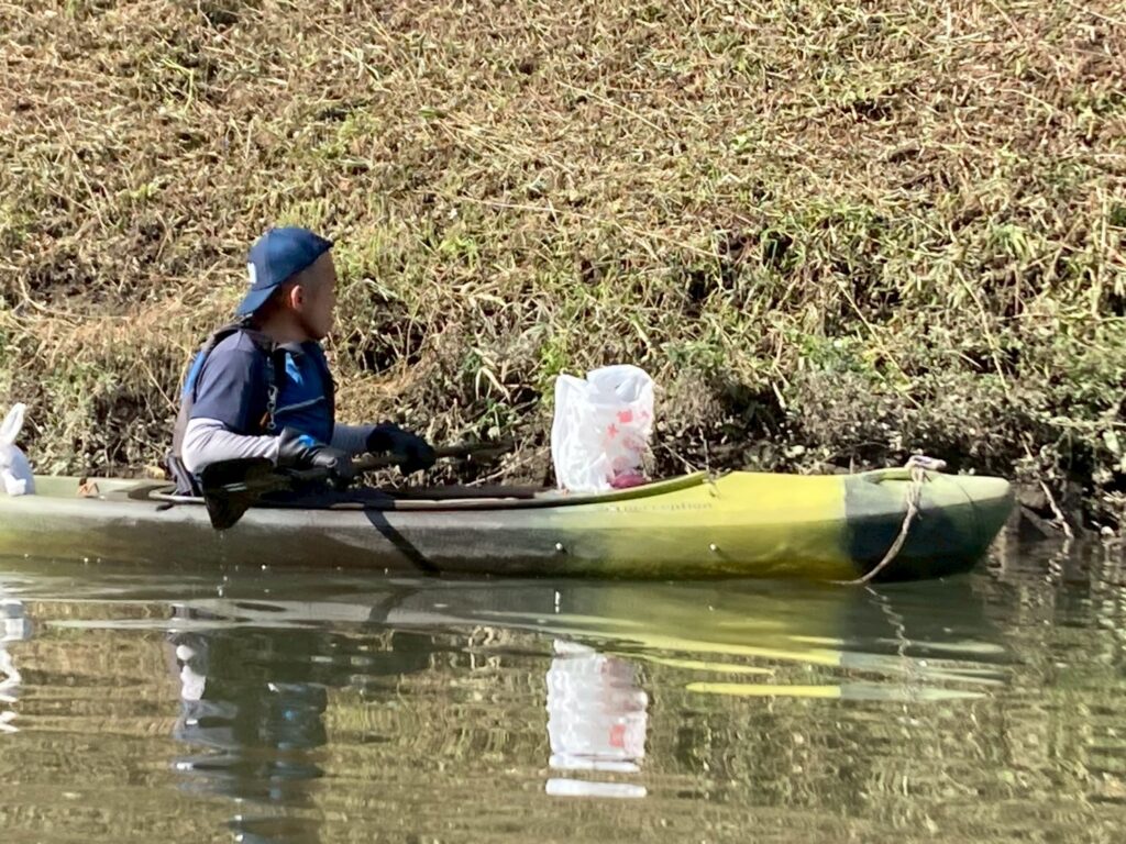 風も無く、流れも緩やかだったので、風間を目指すことに。いざという時のためにパパはタンデムでサポートです。最初は少し緊張していましたが、段々慣れて来て、ゴミも拾えるようになりました。