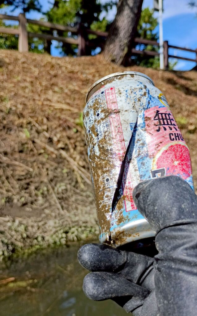 草刈機で破損したと思われる空き缶なども多数拾いました。草に紛れていたゴミが川に落ちたのか、全体にごみが多かったです。中腹にはまだたくさんのゴミが残されているので、コレも今後落ちてくるかもしれません。