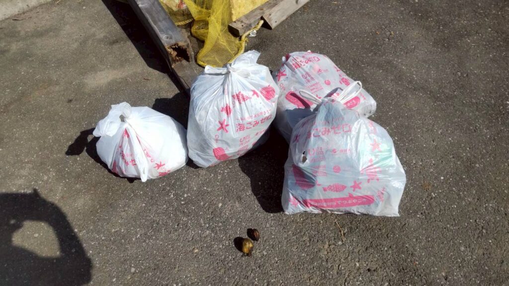 水上に出る前に、艇庫の草刈り後の後始末を実施。太い茎などは縛って、枯れて体積の減った蔓や葉はまとめてビニール袋へ。まだ半分ほどほどは残っていますのでまた次回に。