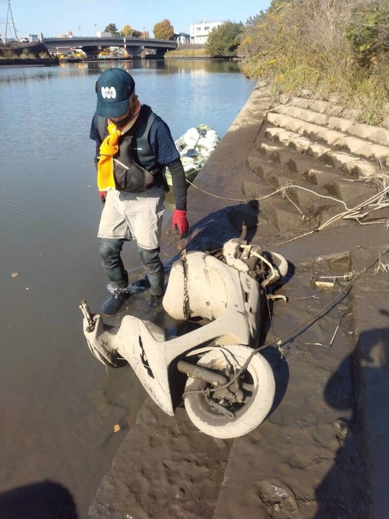 本日水量少なく浅くなっていたため、蒲生にずっと放置されていたバイクをようやく引き上げに成功し、無事回収することができました。