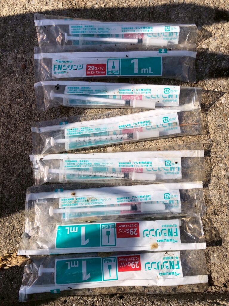 【ゴミの特徴】未使用注射、木材、家庭ごみ、プラスチックごみ、缶 など