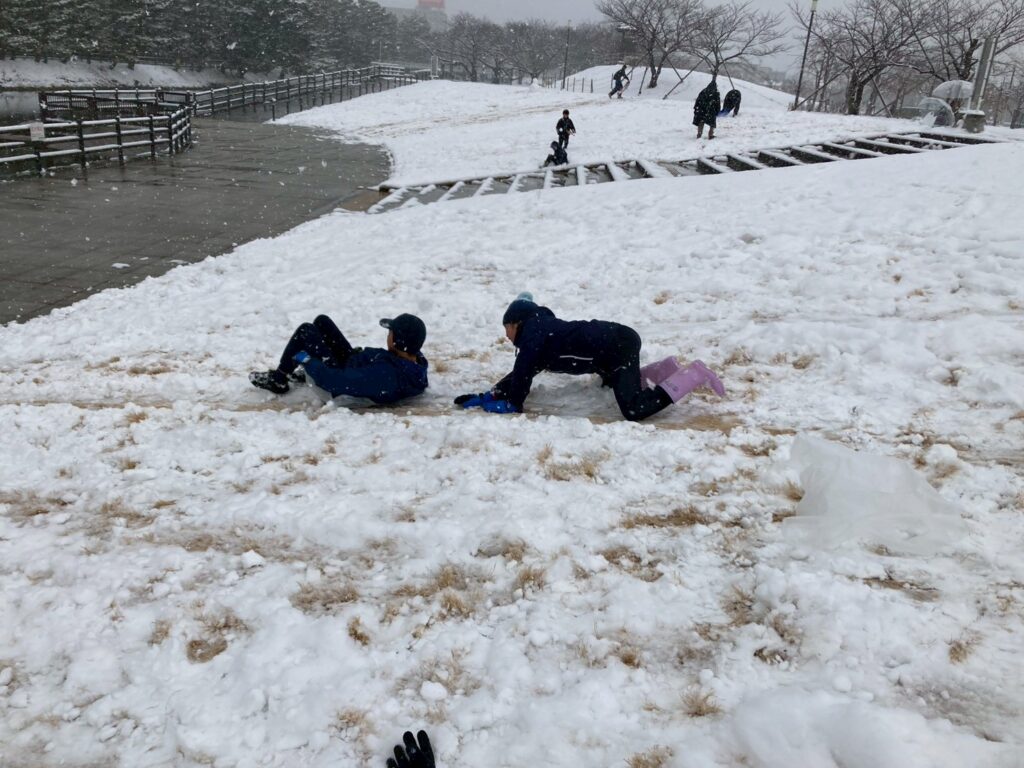 間宮さん見守る中、南さん親子も合流、雪合戦やソリ遊び。