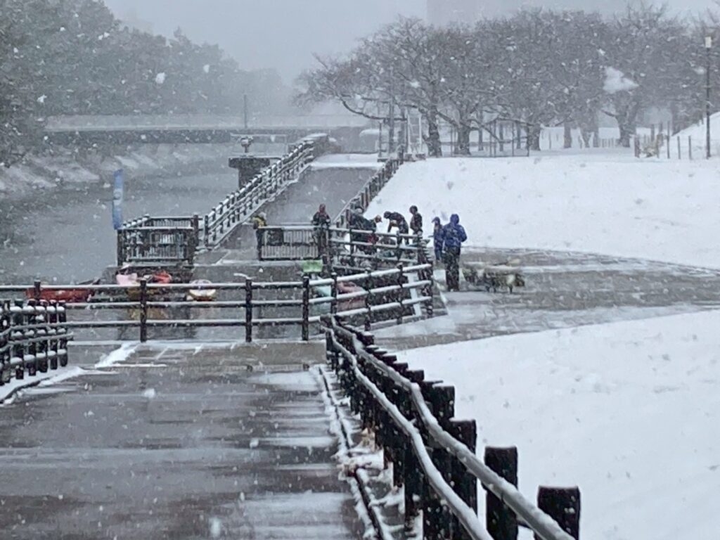 積雪の草加松原を楽しみながら、無事に左岸船着場へ到着。