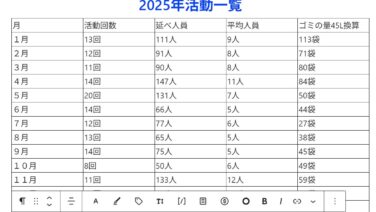 2025年月別活動一覧表月活動回数延べ人員平均人員ゴミの量45L換算1月13回111人9人113袋2月12回91人8人71袋3月11回90人8人80袋4月14回147人11人84袋5月20回131人7人50袋6月14回66人5人44袋7月1...